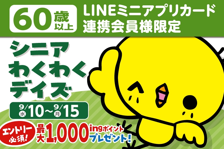 9月10日(水)~9月15日(月)まで60歳以上のLINEミニアプリカード連携会員様限定!シニアわくわくデイズ実施中です。参加するを押してエントリー後、期間中にいなげやでお買い物をすると抽選で5名様に1,000ingポイントが当たる!まずは下記からエントリーをお願いします!詳細はLINEミニアプリをチェック♪