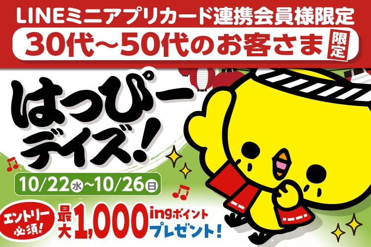 10月22日(水)~10月26日(日)まで30代~50代のLINEミニアプリ連携会員様限定!「はっぴーデイズ」実施中です★LINEミニアプリにカードを連携し、アンケートに回答した後にお買い物をすると、抽選で最大1,000ingポイントが当たる!まずはアンケートからエントリーをお願いします!詳細はLINEミニアプリをご覧ください♪