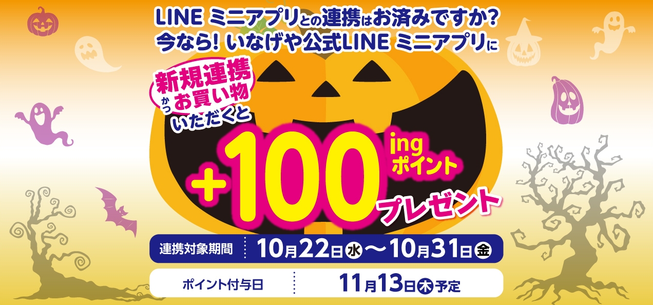 10月22日(水)~10月31日(金)まで初めてing・fanカードをLINEミニアプリに連携した方限定!いなげや店舗でお買い物をすると100ingポイントがもらえる★詳細はLINEミニアプリをご覧ください♪