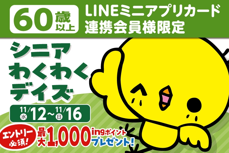 11月12日(水)~11月16日(日)まで60歳以上のLINEミニアプリカード連携会員様限定!シニアわくわくデイズ実施中です。参加するを押してエントリー後、期間中にいなげやでお買い物をすると抽選で5名様に1,000ingポイントが当たる!まずは下記からエントリーをお願いします!詳細はLINEミニアプリをチェック♪