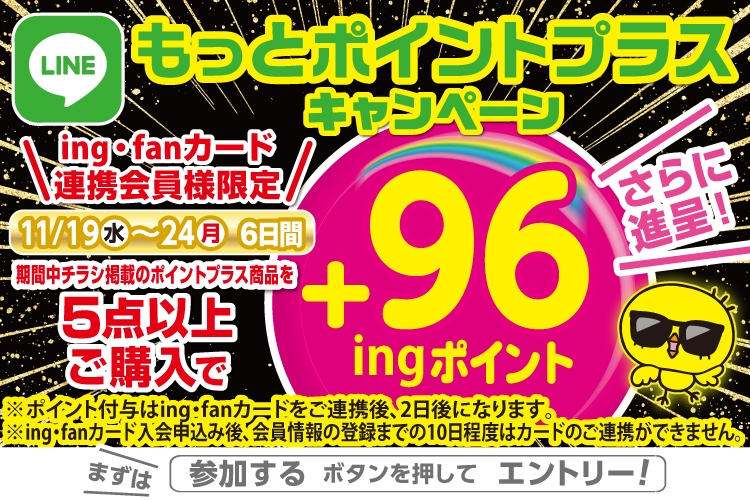 11/19(水)~11/24(月)まで【特別号】もっと!ポイントプラス実施中です★参加条件はing・fanカードをLINEミニアプリに連携して、対象企画の参加するボタンをタップし、対象商品を5点以上購買すると、もれなく96ingポイントプレゼント!まずは対象企画の「参加する」ボタンを押してエントリー!詳細はLINEミニアプリをご覧ください♪