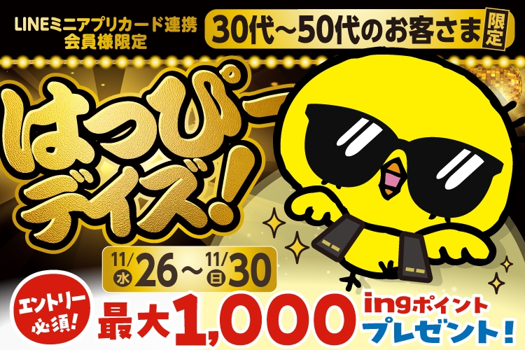 11月26日(水)~11月30日(日)まで30代~50代のLINEミニアプリ連携会員様限定!「はっぴーデイズ」実施中です★LINEミニアプリにカードを連携し、アンケートに回答した後にお買い物をすると、抽選で最大1,000ingポイントが当たる!まずはアンケートからエントリーをお願いします!詳細はLINEミニアプリをご覧ください♪
