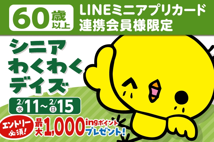 2月11日(水)~2月15日(日)まで60歳以上のLINEミニアプリカード連携会員様限定!シニアわくわくデイズ実施中です。「参加する」を押してエントリー後、期間中にいなげやでお買い物をすると、後日抽選で5名様に1,000ingポイントが当たる!まずは下記からエントリーをお願いします!詳細はLINEミニアプリをチェック♪